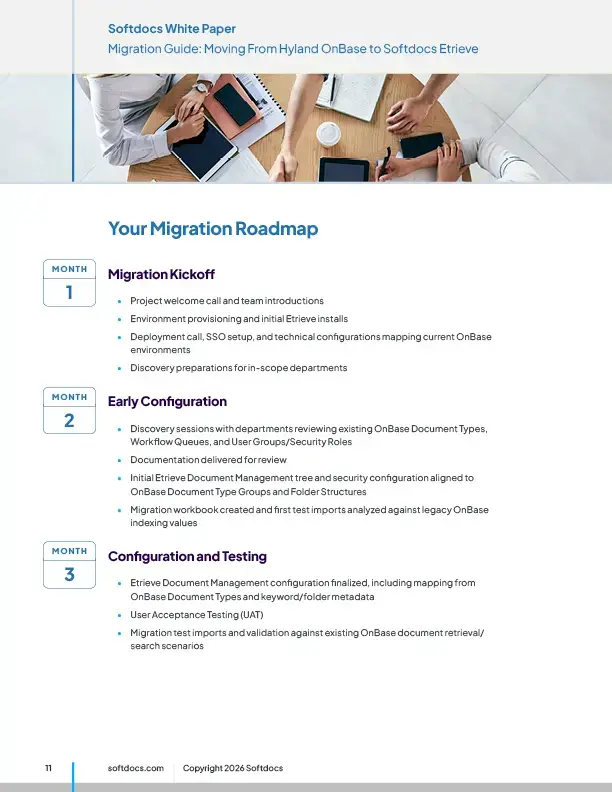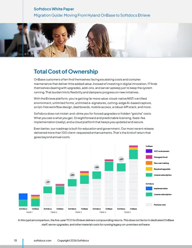 After 10+ years with a legacy document management system, we chose Softdocs. Their system offers unlimited e-forms and e-signatures, which is a significant advantage over using multiple solutions and paying for each envelope or document. We migrated over 8 million documents from our legacy system, redesigned workflows, and consolidated 10+ separate forms into a single super form.