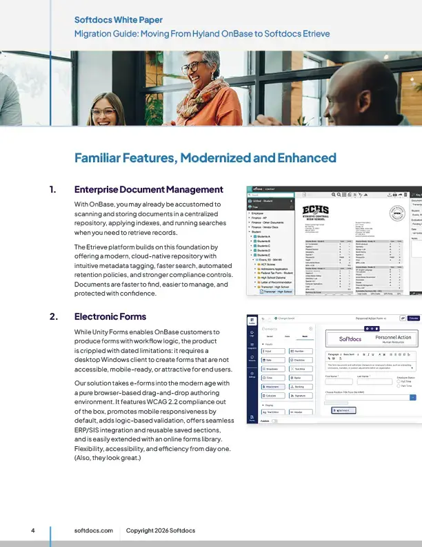 Many OnBase customers struggle with rigid and complicated workflows that require heavy IT intervention. Etrieve Flow modernizes this experience with a no-code, user-friendly workflow builder, conditional routing, and data integrated from your SIS/ERP.